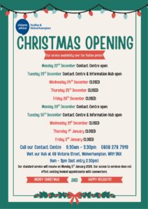 Christmas 2025 Opening Hours Published: 18 December 2025 Category: Blog Previous post Notice of the Annual General Meeting of Citizens Advice Dudley and Wolverhampton